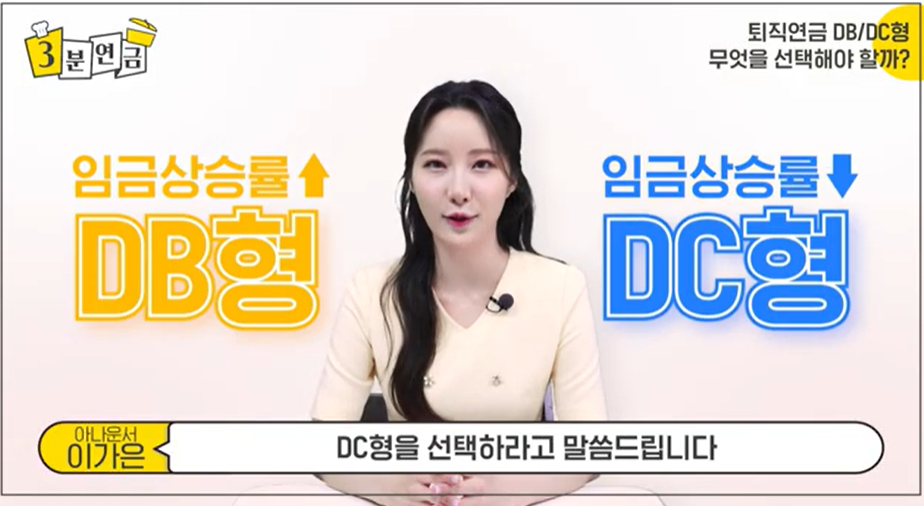 위에 아리따운 아나운서님이 말하듯이 간단하게는 임금상승률과 운용수익률로 비교했을 때, 더 자신 있는 부분을 선택하여 dc,db형을 선택하면 될 것 같다.