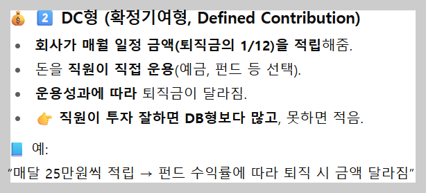 dc형은 확정기여형으로 회사에서 매달 적립식으로 퇴직금을 넣어주는 것이다. 위에 db형과는 다르게 금융기관의 상품을 내가 직접 골라서 운용하는 방식이다. 수익손실에 따라 내 퇴직금에 변동이 생긴다는 뜻이다. 퇴직금 계산방법 또한 db형과 다르다. dc형은 퇴직금의 1/12를 매달 적립해주는 것인데, 퇴직금은 연간임금총액의 1/12이라고 생각하면 될 것같다.