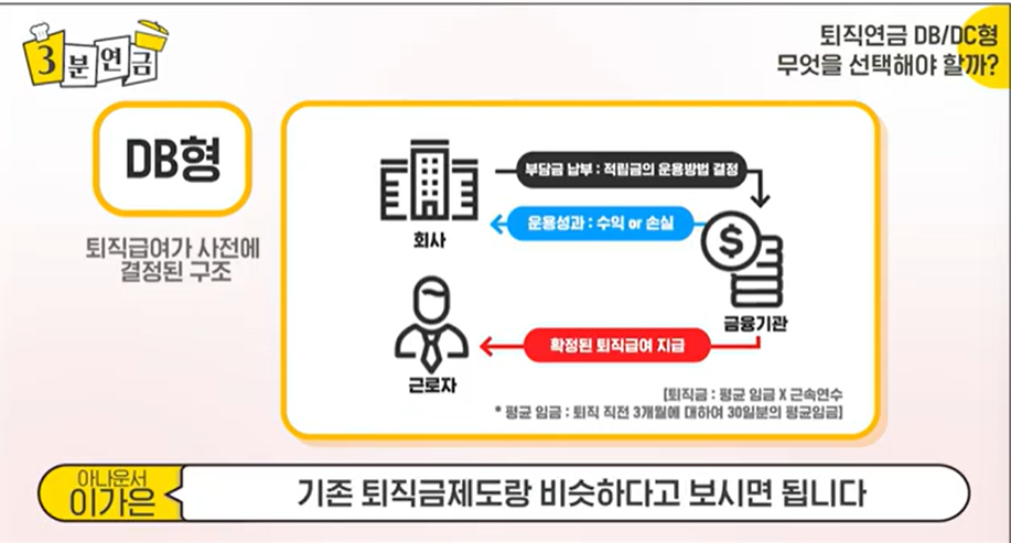 db형은 확정급여형으로 불리는데, 그 이유는 퇴직금을 금융기관에서 운용을 하지만 수익손실과 관련없이 퇴직금 계산법에 따라서 확정 지급이 되기 때문이다.